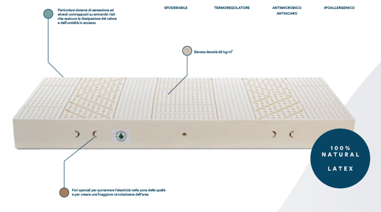 100% dalla natura. Schiuma di lattice naturale al 100% significa che il lattice contenuto nel composto utilizzato per la costruzione del materasso è totalmente naturale. Si estrae manualmente praticando incisioni diagonali in la corteccia che permette di raccogliere 30 ml di lattice ciascuno. La schiuma è realizzato con latte di lattice vulcanizzato e il risultato è un prodotto con straordinaria elasticità, traspirabilità e resistenza agli acari della polvere e muffe.