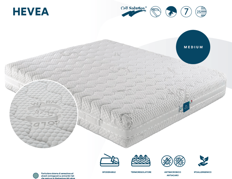 In sintesi, il materasso Hevea è un prodotto di alta qualità, progettato per offrire un riposo confortevole, salutare e rigenerante. La combinazione di lattice naturale e rivestimento in Cell Solution lo rende una scelta eccellente per chi cerca un materasso che si prenda cura del proprio benessere a 360 gradi.