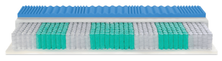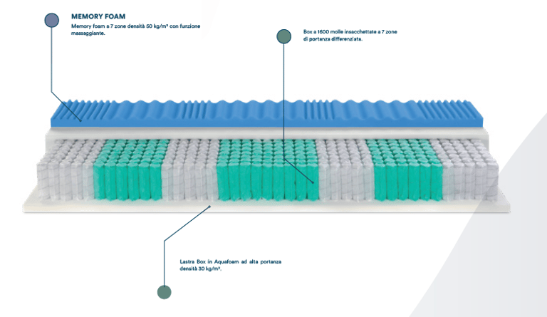 Materasso a molle insacchettate composto da strato in Memory foam a 7 zone con funzione massaggiante, lastra Box in Aquafoam ad alta portanza con 1600 molle insacchettate. Questo permette una reazione progressiva e automodellante. L'insieme delle molle distribuite su SETTE ZONE risponde con una spinta proporzionata al peso, permettendo al materasso di seguire in modo equilibrato le naturaliforme del corpo.