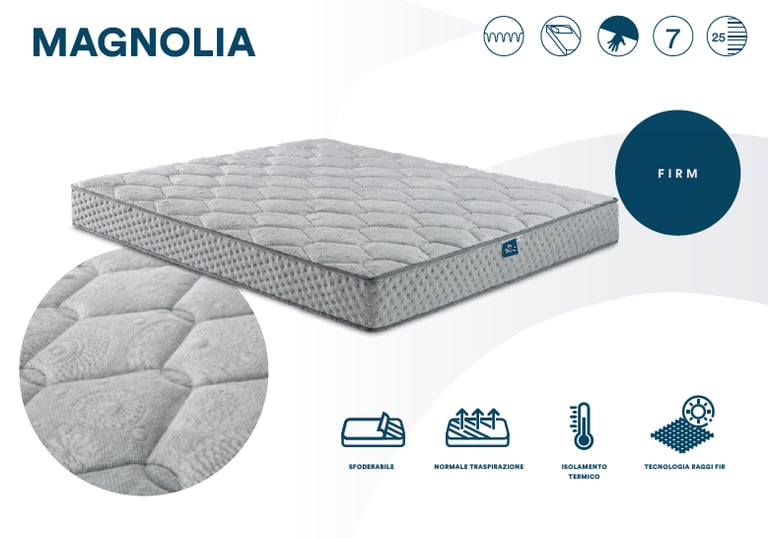 Magnolia è disponibile in diverse misure per adattarsi a ogni tipo di Ietto e di esigenza. È un materasso di media rigidità, adatto a chi cerca un buon sostegno senza rinunciare al comfort.